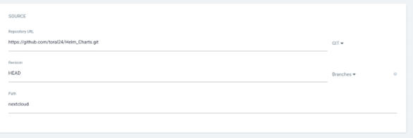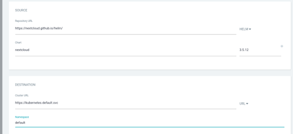 En source habrá que añadir la url donde se encuentra el chart de nextcloud en este caso: https://nextcloud.github.io/helm/