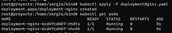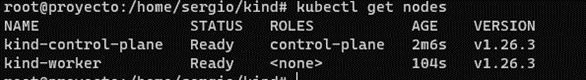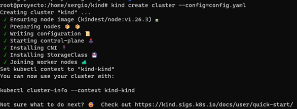 Una vez se ha instalado todos los recursos necesarios habrá que comprobar que todo funciona correctamente. Al crear el clúster con kind la salida deberá de ser la siguiente: