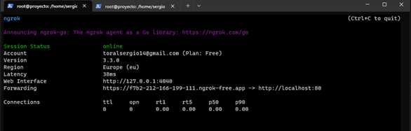 De esta forma ya estaría disponible el servicio de ngrok, con el siguiente comando se puede exponer un puerto al exterior en este caso el 80:
