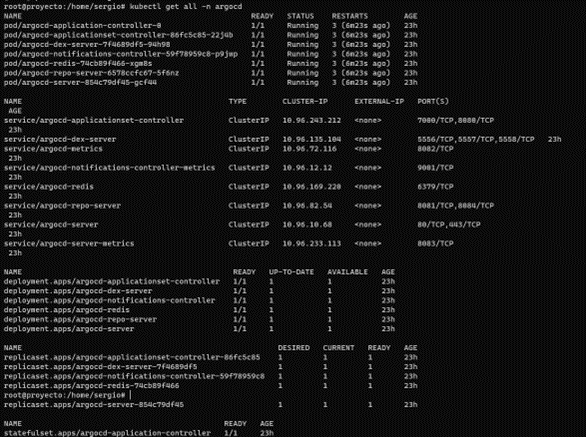 Una vez ejecutados estos comandos si no se ha producido ningún error se puede ver que están disponibles todos los objetos de ArgoCD: