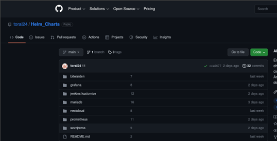 El siguiente paso sería crear un repositorio de GitHub con el nombre de Charts_Helm, seguir las indicaciones para subir el directorio en el que se almacenarán los charts y buscar algunos charts en otros repositorios, copiarlos con git clone URL a este directorio (borrar todos los ficheros y directorios que no estén relacionados con el chart que se quiere utilizar). De esta forma se puede modificar los charts públicos y utilizarlos en AgoCD desde el repositorio propio de GitHub. En este caso se van a crear dos aplicaciones (una con helm y otra con kustomize):