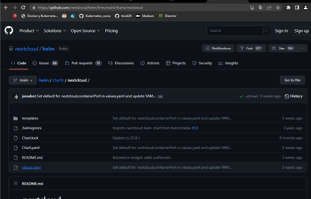 - Fichero values.yaml dentro del repositorio de nextcloud: