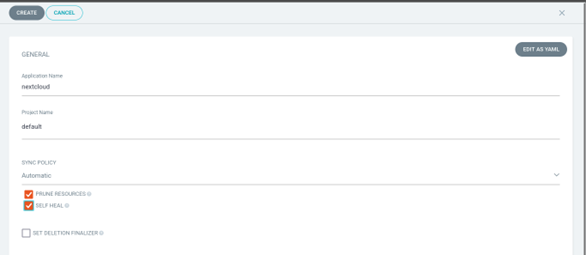 En este caso se va a instalar la aplicación NextCloud, por lo que ,se le dará este nombre, en project name se dejará default y en sync policy automatic, dejando la parte superior de la siguiente forma: