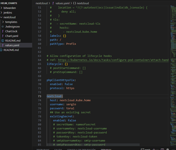 En este caso como se ha utilizado directamente el chart con el repositorio oficial de NextCloud habrá que mirar dentro del archivo values.yaml el usuario y la contraseña, obviamente esto solo es una prueba y lo correcto sería hacer como en el siguiente punto y descargarlo, modificarlo y subirlo a un repositorio propio (utilizando un secret encriptado a ser posible por seguridad).